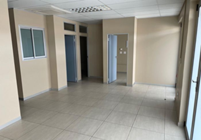 173 m² office space with 3 offices, reception, kitchen, ablutions, and 5 parking spaces. Available immediately.