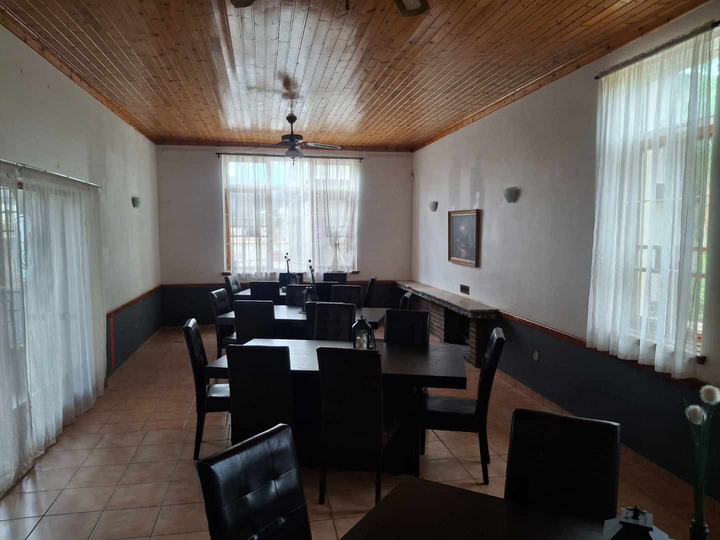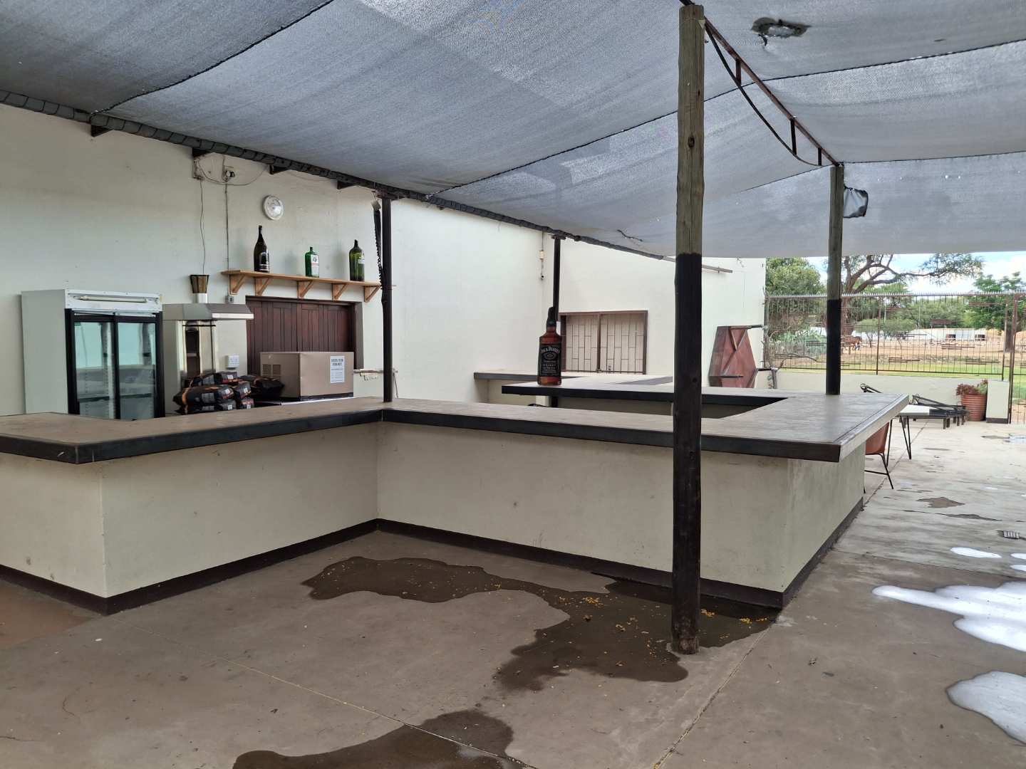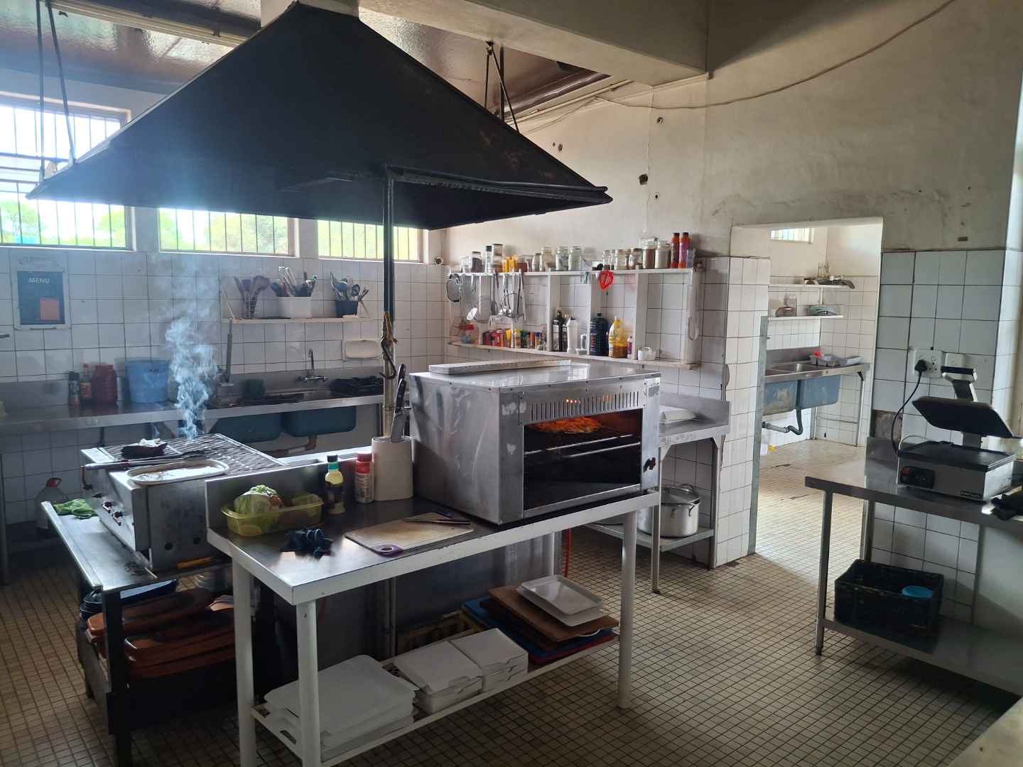 Bar, Dining hall, Kitchen, store rooms, pool room, Large hall for private parties, Outside bar area, 2 bedrooms and bathroom upstairs